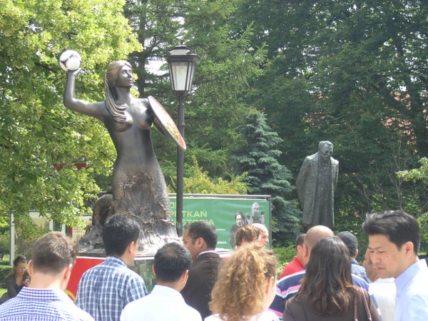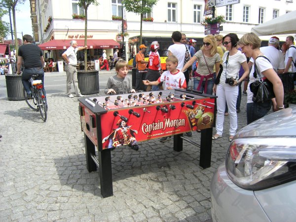 Piłkarskie dekoracje przybrały różne formy – od takich, które budzą pozytywne emocje, po zwyczajną, trudną do wytłumaczenia tandetę. Piłkarzyki, które stoją w kilku miejscach Warszawy (na zdjęciu – stojące na skrzyżowaniu Chmielnej i Nowego Światu), są z pewnością miłym akcentem w przestrzeni publicznej, animującym ją społecznie. Z kolei poustawiane w różnych miejscach miasta syrenki, stylizowane na rzeźbę syrenki warszawskiej dłuta Konstantego Hegla (tej, której replika stoi na rynku Starego Miasta), trzymające piłkę zamiast miecza i mające flagi uczestników turnieju na tarczy, to zdecydowanie nietrafiony pomysł. Jak ktoś słusznie zauważył, te piłki rozmiarem są bliższe piłce ręcznej niż nożnej.