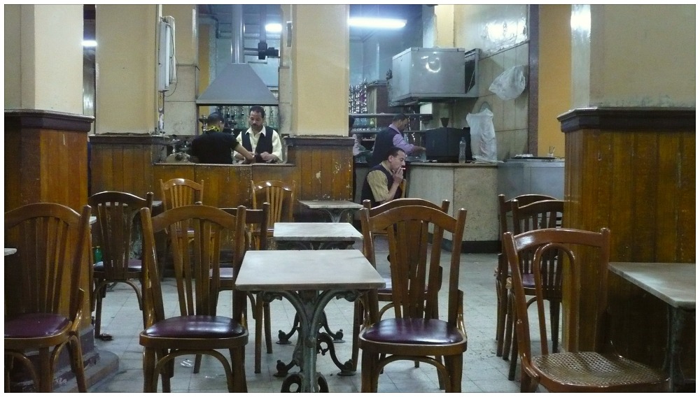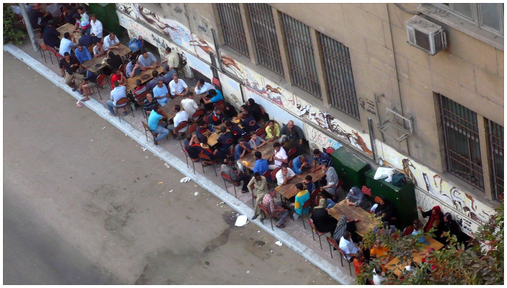 Kwintesencją arabskiego życia w Egipcie są stare herbaciarnie i kawiarnie, które zapełniają się każdego wieczoru kumplami z sąsiedztwa. Młodzi i starzy przychodzą załatwiać tam swoje sprawy, zapalić fajkę, pograć w backgammona, obejrzeć mecz w czarno-białym telewizorze, poczytać gazetę albo po prostu posiedzieć i pogadać. Między stolikami przemykają sprzedawcy zegarków i okularów lub dzieciaki próbujące za parę drobnych wcisnąć paczkę chusteczek higienicznych. Kelnerzy roznoszą szklaneczki z herbatą lub kawą i zagadują gości. Wszyscy tutaj dobrze się znają. Spośród oliwkowych twarzy Egipcjan można wyłowić twarze podróżników z całego świata. Są tacy, którzy swoje wrażenia zapisują w telefonie komórkowym, robią zdjęcia. Stali bywalcy przyjmują to ze spokojem. Inni przebieg mijającego dnia zapisują w notesie pełnym wlepek i stempli. Gdzieniegdzie świecą laptopy. Odbywa się giełda kontaktów, wymiana adresów, powstają plany na jutro. Można wyjść za róg po szoarmę lub kebab. W kawiarni długo po północy koncentruje się energia.
