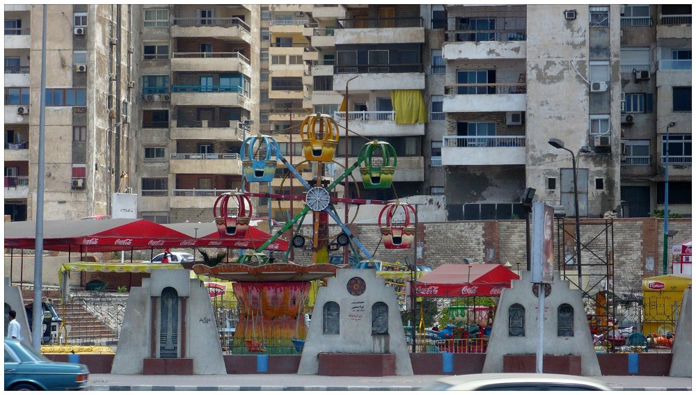 W pejzażu wielkich egipskich miast dominują bloki – wielopiętrowe konglomeraty mieszkań o przedziwnych konstrukcjach, zbite w jedną bryłę z powodu braku przestrzeni. Ich mieszkańcy szukając oddechu, budują małe wesołe miasteczka. Często składają się one tylko z kilku bujanych koników na drobne monety. Czasem są tam też karuzele, huśtawki i piłkarzyki. Nikt nie przejmuje się urwanym oparciem ani tym, że brakuje plastikowych zawodników. Takich miejsc nie omijają nawet całkiem wyrośnięci chłopcy na motorach. W odpowiednim wieku trzeba mieć motor. Koniecznie z głośnym radyjkiem.