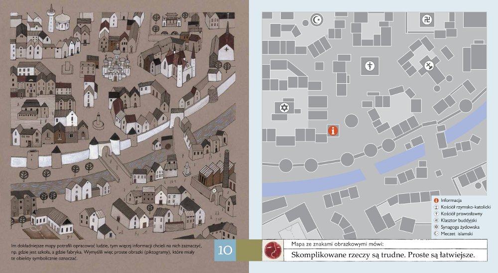 Wspólna lektura jest przyjemnością nie tylko dla dziecka, ale także dla rodzica, bo przyznajmy się – jak wiele entuzjazmu może w sobie wzbudzić dorosły człowiek, czytając po raz setny „Mam przyjaciela budowniczego” (notabene świetna książka dla rozkochanego w kaskach i koparkach przedszkolaka). Kto wie, czym jest mapa T-O, kto słyszał o Forma Urbis Romae albo wie (tak naprawdę!), jak działa GPS? Rozbudowane objaśnienia na końcu książki do map opisanych wcześniej w tekście to ciekawa i solidna porcja wiedzy. „Dokąd iść?” to także książka pełna szacunku dla możliwości poznawczych dziecka i dorosłego: jest napisana prostym, ale eleganckim językiem, nie upraszcza ani nie infantylizuje.