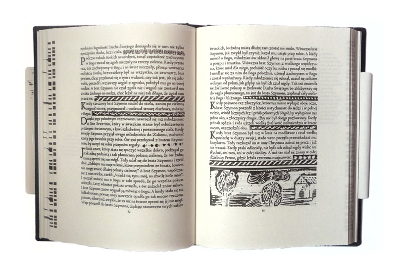 Dębniak posłużyła się trzema rodzajami czcionek, które współgrają w tym teatrze tekstowego świata. Piętnastowieczną antykwę co i rusz rozbija swoją obecnością czcionka neogotycka, obu towarzyszy zaś na marginesach pochodząca z początku XVI wieku kursywa Aldo Manutiusa. Słowa średniowiecznego tekstu w młodopolskim tłumaczeniu wzbogaca porządek obrazów, przepięknych drzeworytów nie tylko ilustrujących tekst, ale i poszerzających jego przestrzeń poza granice litery. Jedne i drugie odciśnięte zostały z wykorzystaniem prasy drukarskiej będącej de facto przerobioną tłocznią do winogron (wynalazek samego Gutenberga). Tak oto „Kwiatki św. Franciszka”, odsyłając do dokonań renesansowego drukarstwa, przywołują zarazem pamięć o średniowiecznych książkach drzeworytniczych, ale i o XX-wiecznych dokonaniach tej sztuki, jak utworzone z drzeworytów poematy i powieści graficzne Fransa Masereela („Mon livre d’heures”; „Idée – sa naissance, sa vie, sa mort”). Doprawdy nie sposób oddać sprawiedliwości tej edycji „Kwiatków”. Niezwykła to przyjemność trzymać w ręku tak zmysłowy przedmiot. A pamiętajmy, że pojęcie „estetyki” (aisthesis) odsyła właśnie do doświadczeń cielesnych, do wymiarów zmysłowego doświadczania świata. W tym wypadku porządek treści spotyka się z materią znaków i fizycznością książki, parabola życia duchowego zbiega się z krojem czcionek i fakturą papieru. Z jednej strony wpisuje się to poniekąd w wyśpiewywaną przez świętego Franciszka wielką pochwałę stworzenia w jego porządku fizycznym,
