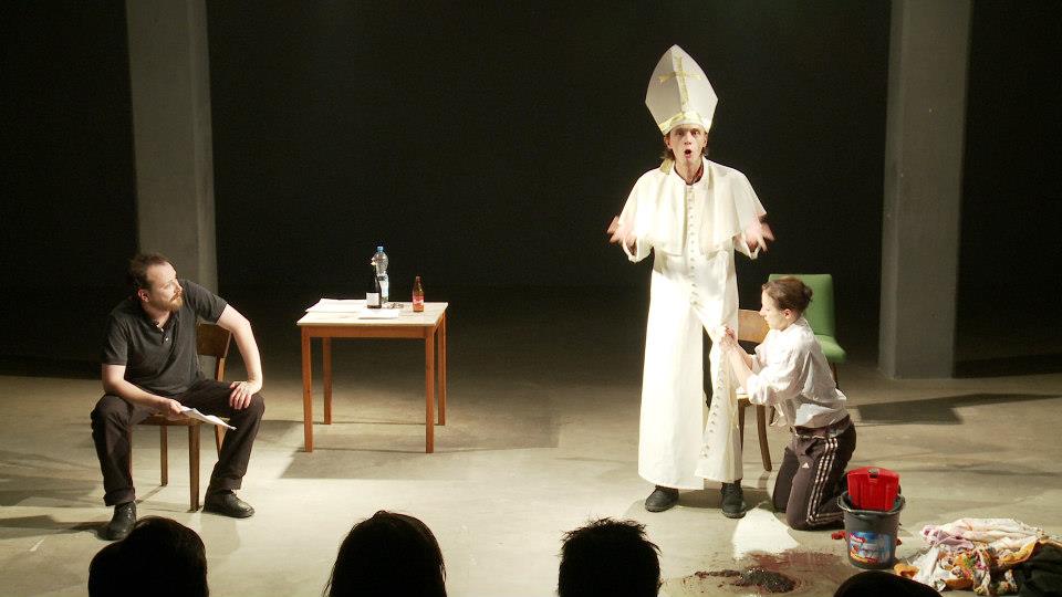 Na scenie: Agnieszka Kwietniewska, Andrzej Kłak, Paweł Demirski (jako Dario Fo)