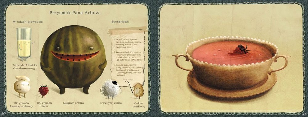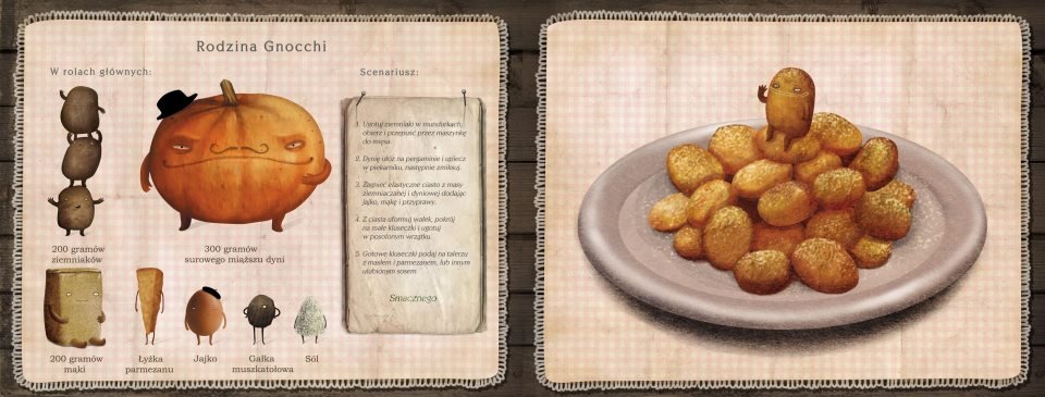 Oczywiście wszystko to dałoby marny efekt, gdyby nie fantastyczna szata graficzna. Nie tylko wesołe ziemniaczki czy wymuskane ogórki cieszą oko, ale każdy element książki. Nie znajdziecie tu szczegółu, który nie byłyby przemyślany i dopasowany do reszty, tak aby otrzymać efekt doskonały. Autorka niniejszej skromnej recenzji była niejadkiem jeszcze w poprzednim stuleciu, ale zaświadcza, że spędziła długie kwadranse na delektowaniu się prezentowaną książeczką jak najwykwintniejszym daniem.