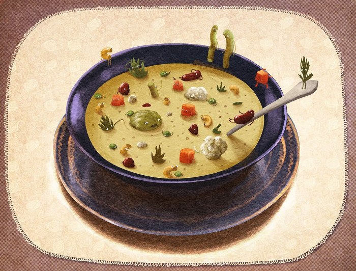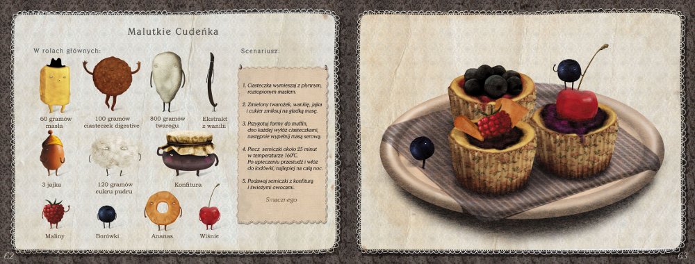 Nie znajdziecie tu pięknych fotografii gotowych potraw. Efekt kuchennych wysiłków różnych warzyw i owoców nie zostanie przyćmiony przez propozycje podania przygotowane z udziałem sztabu fotografów i grafików. W „Gratce” efekt końcowy to także opowieść: omlet to pierzynka dla listka szpinaku, miska zupy marchewkowej to wanna, w której jak basza rozkłada się zadowolona marchewka, a gofry to konstrukcje, przy których pracowicie krzątają się truskawki.