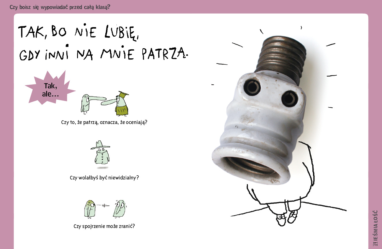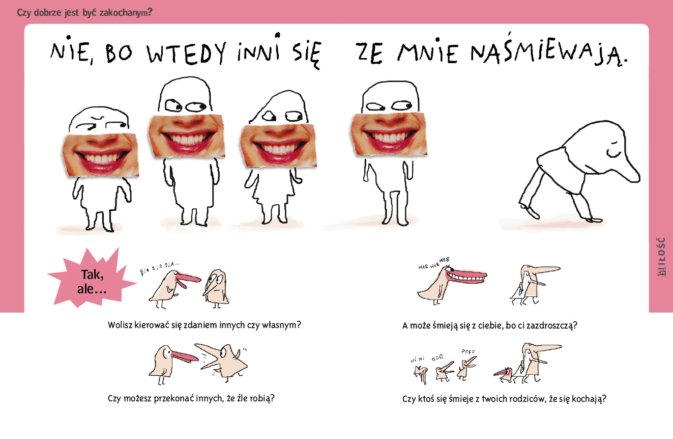 „Uczucia…” poruszają sześć tematów: dowody miłości („Skąd wiesz, że rodzice cię kochają?”), zazdrość („Czy jesteś zazdrosny o swoich braci i siostry?”), konflikt („Dlaczego kłócisz się z tymi, których kochasz?”), miłość („Czy dobrze jest być zakochanym?”) i przyjaźń („Czy wolisz być sam, czy z przyjaciółmi?”). Ostatni rozdział, poświęcony nieśmiałości („Czy boisz się wypowiadać przed całą klasą?”), wydaje się najbardziej pragmatyczny. Przytoczone odpowiedzi to garść realnych lęków, które często ciągną się za młodym człowiekiem aż do dorosłości, gdy ze splątanymi nogami i językiem usiłuje przedstawić prezentację większemu gronu słuchaczy. Lęki związane z publicznym wystąpieniem są oswajane przez kolejne pytania, które mają zachęcić czytelnika do analizy całej sytuacji, a nie tylko swoich emocji.