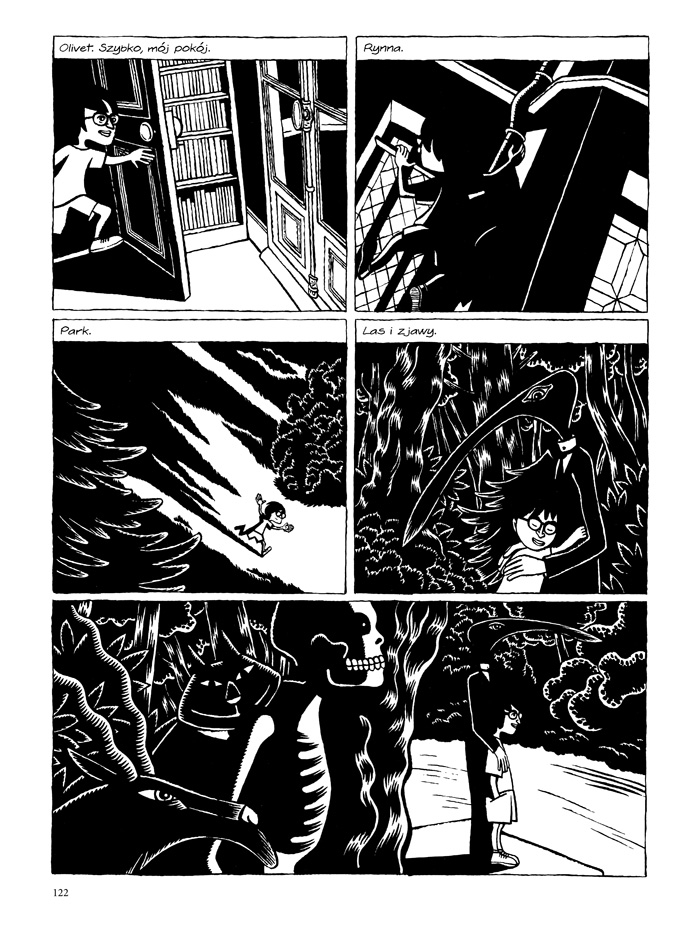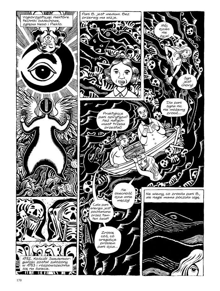 Nie jestem miłośnikiem komiksów, w których dominuje literacka narracja, a takie wrażenie z początku sprawiają „Rycerze świętego Wita”. To jednak tylko pozory. Zatrzymując się przy tym aspekcie, warto porównać dzieło Davida B. z innym, powstającym w niemal w tym samym okresie (lata 1995–2005) komiksem – „Black Hole” Charlesa Burnsa. Mimo że komiks amerykańskiego kolegi po fachu to opowieść obyczajowo-psychologiczna, z dużą dozą wątków autobiograficznych, to ze względu na metafory związane z horrorem cielesnym, często wymieniany jest w rankingach najlepszych obrazkowych opowieści grozy. Podobna zależność pojawia się między warstwą literacką a graficzną „Rycerzy świętego Wita”. Podczas gdy na pierwszym planie możemy śledzić historię bezsilności w walce z chorobą, na drugim – w warstwie graficznej – rozgrywa się zupełnie inna, nie mniej ważna opowieść. Lata sześćdziesiąte i siedemdziesiąte, czyli okres największej popularności ruchu New Age, zostały w komiksie Davida B. przedstawione inaczej, niż zwykło się to czynić. Dla autora są to czasy równie mroczne i niepokojące, co Berlin lat trzydziestych, w którym