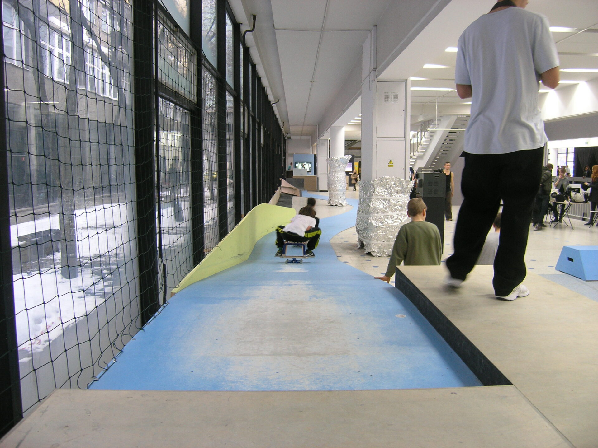 To trochę zabawne, że miejsce przeznaczone na aktywności, które normalnie kojarzylibyśmy ze świeżym powietrzem (m.in. jazda na rolkach, desce, sanki, etc.), znalazło się pod dachem, a na dodatek w Muzeum Sztuki Nowoczesnej. Gdy jednak spojrzymy na zaskakującą drogę, jaką przebył Skwer, nic nas już nie zdziwi (ostatecznie zima też trochę to tłumaczy). Nie chcę jednak w tym miejscu odtwarzać jego historii (choć jest to niezwykła opowieść), skupię się raczej na tym, co Skwer – w formie, w jakiej został zaprezentowany w pawilonie Emilii – mówi nam o mieście i problemach tworzenia przestrzeni publicznej.