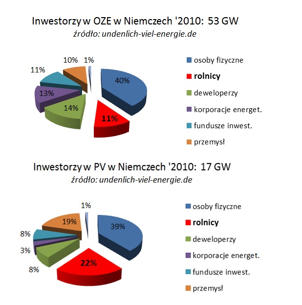 Jeszcze większe różnice występują w strukturze własności OZE, a w szczególności w obecnie najbardziej dynamicznym segmencie – energetyki prosumenckiej. W Niemczech już w 2010 r. funkcjonowało ponad 4 mln producentów energii elektrycznej z OZE. Większość tych producentów posiadała niewielkie instalacje (średnia moc ok. 20 kW). Na rysunku przedstawiono strukturę niemieckich inwestorów w całej branży OZE oraz, dla przykładu, w fotowoltaice (produkującej energię elektryczną z energii słonecznej – przyp. red.].