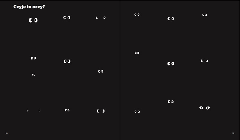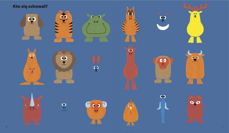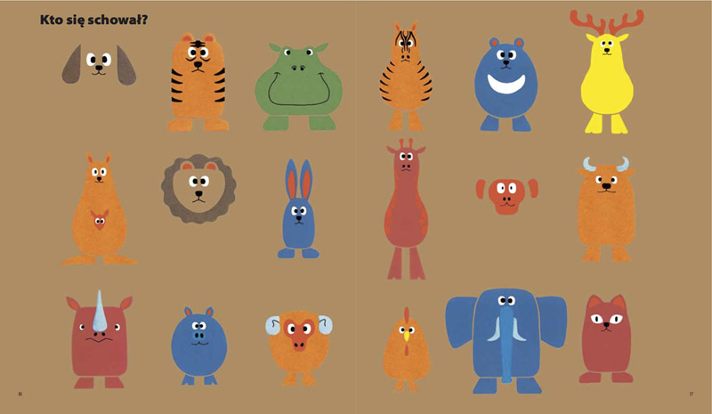 I w tym właśnie miejscu do głosu dochodzą dodatkowe atuty tej książeczki. W kontakcie z nią dziecko musi uruchomić spostrzegawczość i podążać w swej obserwacji od ogółu do szczegółu. Ćwiczona jest tu nie tylko jego pamięć, lecz także, a może przede wszystkim, analiza i synteza wzrokowa. Maluch musi spostrzec i wyróżnić spośród zwierząt przedstawionych na stronie to jedno wyjątkowe, które przejawia daną cechę w odróżnieniu od pozostałych (na przykład marszczy brwi ze złości, stoi tyłem, po pyszczku płynie mu łza…). Dziecko musi podążać wzrokiem po stronicach w prawo i w lewo, w górę i w dół, rozpoznawać i rozróżniać kształty i kolory. Aby mu to ułatwić, japoński autor, podobnie jak autor słynnej króliczki Miffy, Dick Bruna, wykorzystał proste, wyraziste kolory: zielony, czerwony, niebieski, żółty, pomarańczowy, a sylwetki zwierząt mają bardzo uproszczone kształty. Można powiedzieć, że są to ledwie zarysy postaci zwierząt z wyraźniej zaznaczonymi cechami dystynktywnymi. Te potraktowane z przymrużeniem oka postaci mają śmieszne, trochę zezowate oczy, obłe kształty, jakby rysowane niewprawną ręką dziecka.