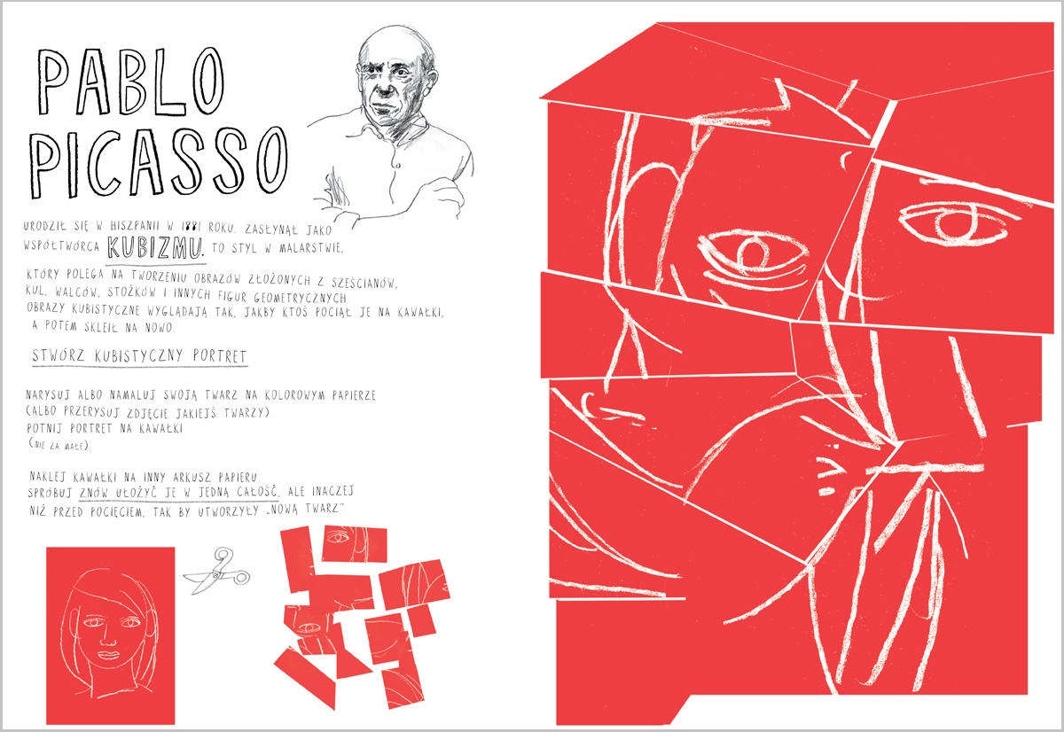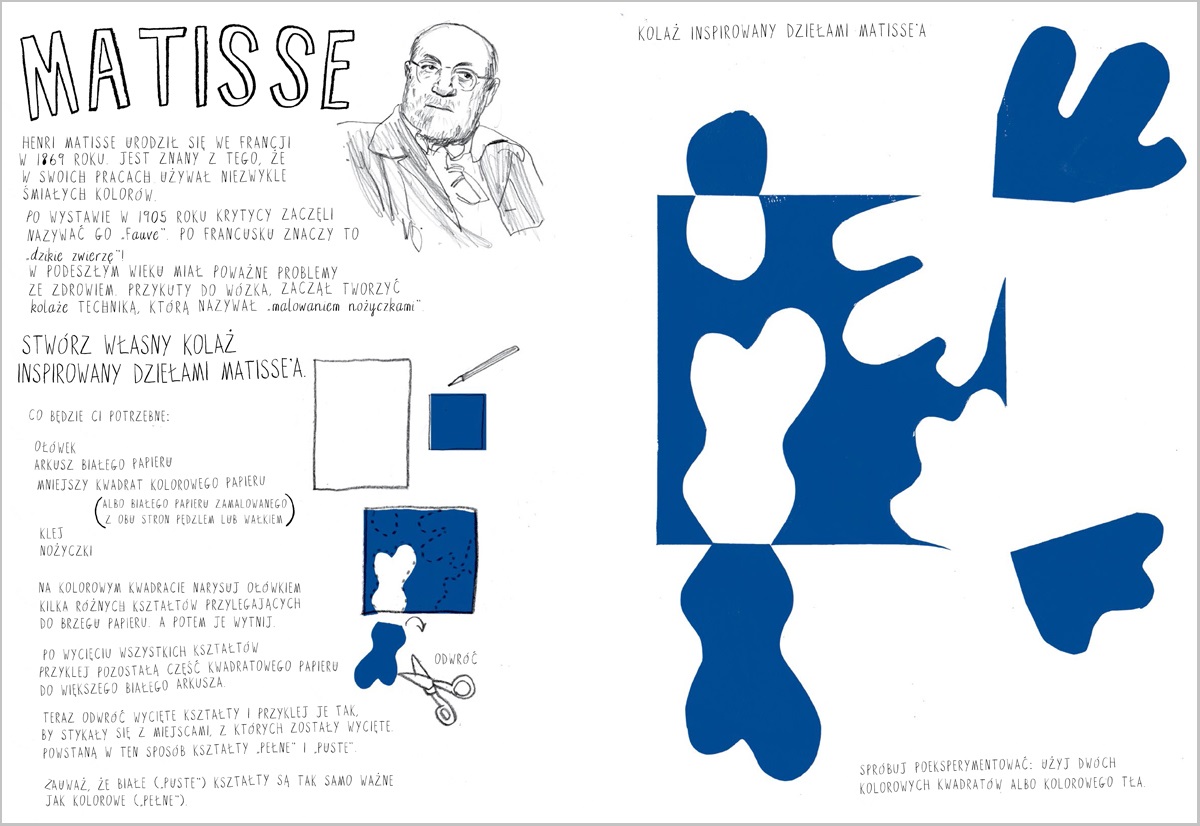 Po potwierdzeniu przez lekarza diagnozy, odwiedzinach w aptece, z której wyniosłam tobołki pełne medykamentów, i dotarciu do domu usiadałam i zaczęłam się zastanawiać, jak – do pioruna – mam utrzymać swoje potomstwo, 8-letniego Bartka i 7-letnią Alicję w domu. W końcu to pierwsze dni wakacji, a ja muszę zapewnić im rozrywkę adekwatną do stanu zdrowia z równoczesnym zachowaniem pełni władz umysłowych. Nie było łatwo. Przy moich dzieciach salomonowe rozwiązania nie istnieją. „Mamo, bo ona…!!!” przeplatało się z „Mamo, bo Bartek…!!!”, a ja czułam, że ich angina przybliża mnie wielkimi krokami do porażki wychowawczej. Kładką nad przepaścią okazała się być książeczka „Zróbmy sobie arcydziełko” Marion Deuchars. Niepozorna błękitna okładka kryje w sobie przechadzkę labiryntem sztuki. Można poczuć się odrobinę jak na objazdowej wycieczce po największych muzeach – otrzeć się o Picassa, Van Gogha, Mondriana, by za chwilę podziwiać pierwotne jaskiniowe malunki.