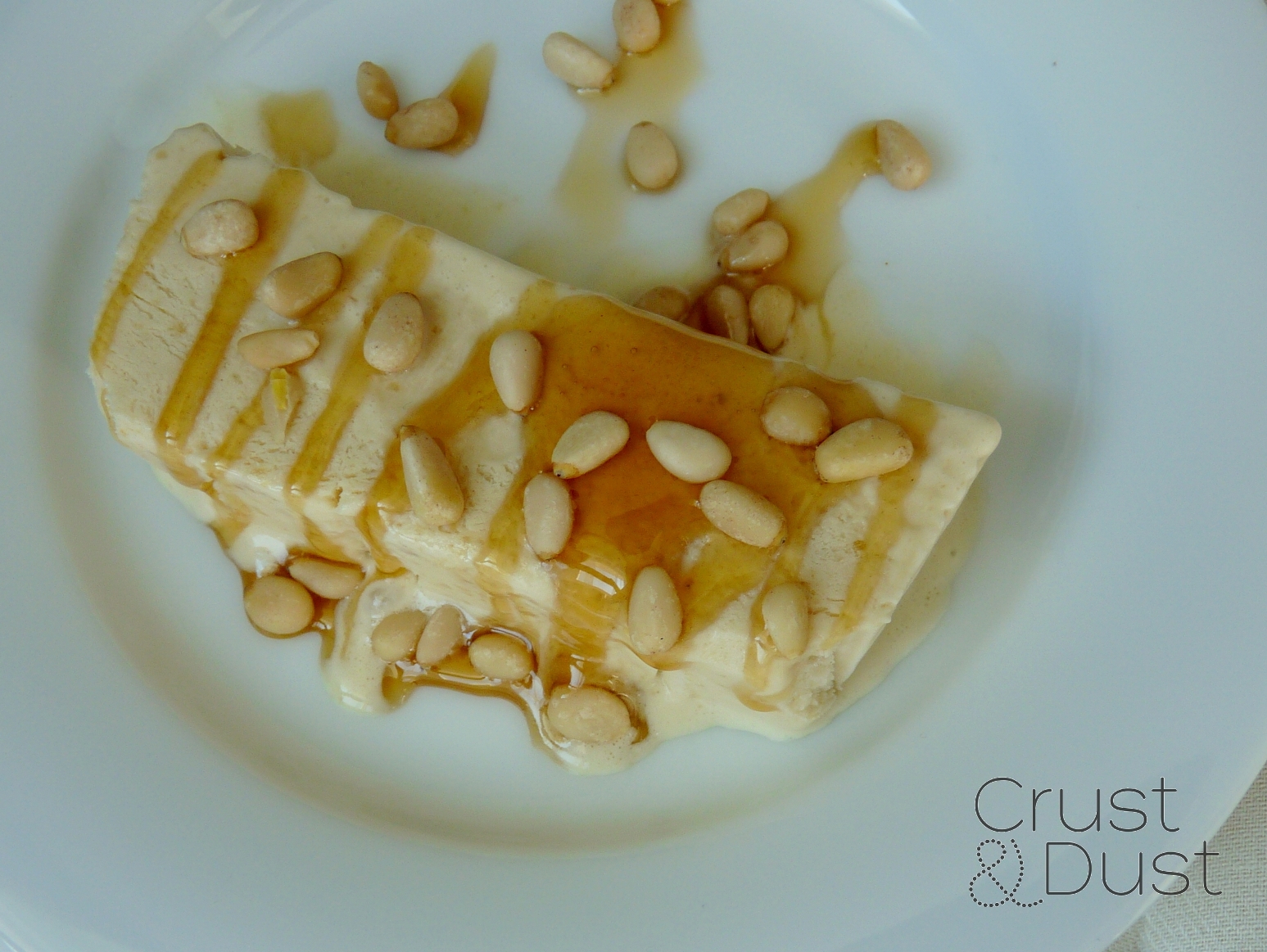 W kąpieli wodnej ubijamy trzepaczką miód i syrop z jajkiem i żółtkami. Przestajemy, kiedy masa zrobi się gęsta. Odstawiamy do wystygnięcia. W międzyczasie ubijamy kremówkę na bitą śmietanę. Łączymy ostudzoną masę miodowo-jajeczną z bitą śmietaną, wlewamy do formy, przykrywamy szczelnie folią. Wstawiamy do zamrażarki na 2–3 godziny. Kroimy na plastry, dekorujemy miodem i posypujemy uprażonymi orzeszkami piniowymi. Uwaga: rozpuszcza się szybciej niż zwykłe lody.