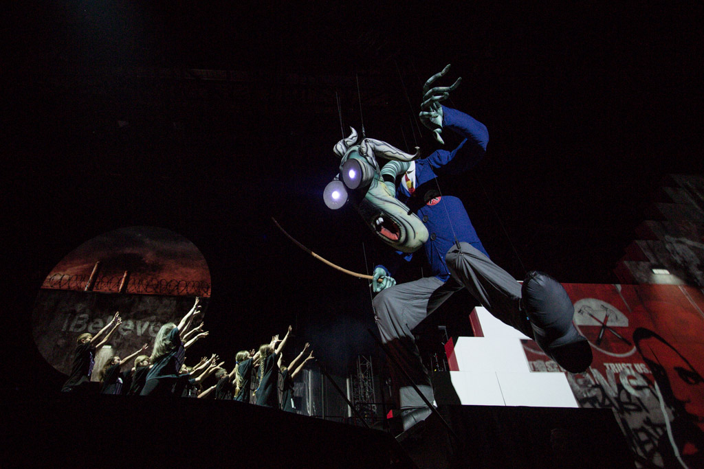 A jest to projekt monumentalny. Można psioczyć na współczesny świat, w którym zamiast podobnych, majestatycznych concept albumów triumfy święcą youtubowe błahostki rodem z Korei Południowej, nie ulega jednak wątpliwości, że to, co w ostatnich dekadach XX wieku było niewykonalne, dziś jest w realizacji koncertów codziennością i oczywistością. Można się sprzeczać nad stopniem wybitności muzycznej strony opowieści o zagubieniu Pinka w świecie totalitaryzmów domowych i państwowych, można narzekać na megalomanię Watersa, nie można jednak nie być pod wrażeniem wizualnej strony jego wizji. Defiladę, którą pod czerwono-czarnymi sztandarami zmyślonego reżimu zafundował, podziwiało około 30 tysięcy osób, a więc prawie cały stadion, znacznie jednak pomniejszony z uwagi na ponadnormatywną wielkość sceny i towarzyszącego jej muru. Ten ostatni był zresztą również ekranem, na którym wyświetlano materiały różnego sortu: od obrazu z kamer na stadionie, poprzez wspomnienia o żołnierzach, ofiarach licznych wojen tego świata, a skończywszy na scenach z opartego na „The Wall” filmu Alana Parkera z 1982 roku. Podczas choćby „Another Brick in the Wall (Part II)” czy „Nobody Home” scena koncertowa zamieniała się w teatralną. Ma Waters ciągoty do aktorstwa, lecz – nie oszukujmy się – to aktorstwo niskiej próby, które bez muzyki nie ma żadnej racji bytu.
