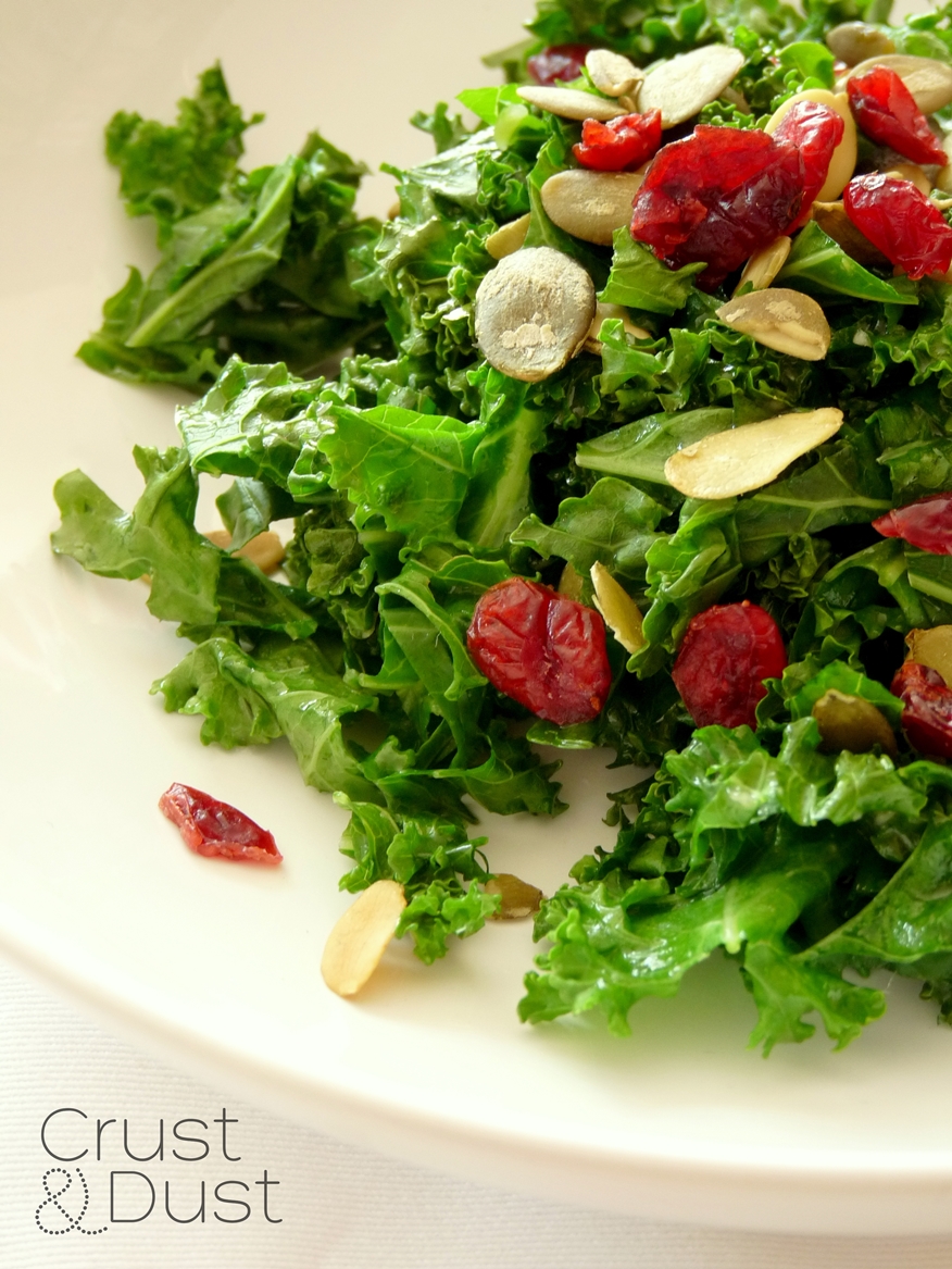 Jarmuż myjemy, wykrawamy twarde części (łodygę z przyległościami), kroimy liście w cienkie paski. Wrzucamy na patelnię, wlewamy wodę i dusimy na małym ogniu przez minutę, aż jarmuż nabierze intensywnie zielonej barwy i nieco zmięknie. Imbir i czosnek obieramy, siekamy drobno, wrzucamy do blendera. Dodajemy miód, ocet ryżowy, olej i blendujemy do powstania jednolitego, gęstego sosu. Gotowy sos mieszamy z jarmużem. Przekładamy na talerze, posypujemy żurawiną i pestkami z dyni.