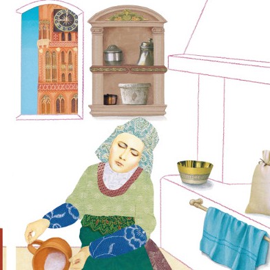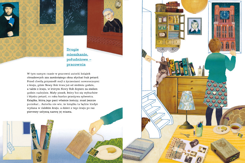 Jak przedstawić czas, jego upływ i ulotność w książce dla dzieci? Czy da się go w ogóle wsadzić w ramy języka? Aby uplastycznić to pojęcie, autorka prowadzi czytelników przez historię miasta, w którym na co dzień pracuje. Wycieczkę wehikułem czasu rozpoczynamy w roku 1500. Niczym Hugo Cabret, bohater książki Briana Selznicka, zerkamy zza tarczy zegara, przyglądając się po kolei czterem pokojom położonym po czterech stronach świata. Co sto lat zmieniamy porę roku i odwiedzamy ponownie tę samą kuchnię, pracownię, pokój dzieci i salon. Czytamy następnie krótkie streszczenie tego, co działo się w Toruniu przez kolejny wiek i oglądamy plan miasta z danej epoki. Pokoje różnią się wystrojem, ich mieszkańcy przychodzą i odchodzą, zmieniają się zabawki i książki na półkach, ale zajęcia, troski i radości pozostają podobne: przygotowanie pierników, podróżowanie, choroba dzieci, chrzest, majacząca w tle wojna, niepewność i nadzieje związane z przyszłością…