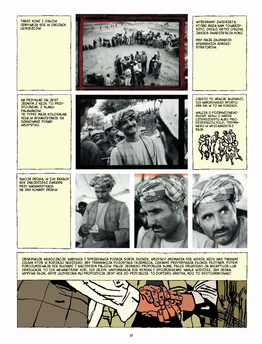 Tytułowy fotograf to Didier Lefèvre, który w 1986 r. wybrał się wraz z grupą Lekarzy bez Granic do Afganistanu – jak pamiętamy, ogarniętego wojną – by udokumentować pracę wolontariuszy tej instytucji, docierających z misją humanitarną do niezwykle trudno dostępnych ludzkich osad. Lefèvre wkracza nagle w świat ludzi, którzy mogliby prowadzić spokojną praktykę medyczną w doskonale zaopatrzonych klinikach Francji, a tymczasem wolą zapuszczać się na niebezpieczne pustkowia i nieść pomoc ludziom żyjącym z dala od cywilizacji, oczywiście w warunkach polowych, i z ciągłym poczuciem zagrożenie wojną. Fotograf przylatuje zatem do Afganistanu, bierze udział w pracach przygotowawczych, poznaje swoich towarzyszy wyprawy, a potem ruszają w drogę. Ekspedycja pozwala nie tylko oglądać przy pracy owych lekarzy z misją, ale stanowi także doskonałą okazję do pokazania, jak żyją zwykli ludzie: a wiadomo, że przyglądając się wizytom medycznym