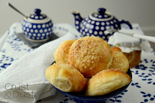 9. Kiedy bułeczki urosną, odkrywamy je. Jajko roztrzepujemy i smarujemy nim bułeczki. Posypujemy cukrem.