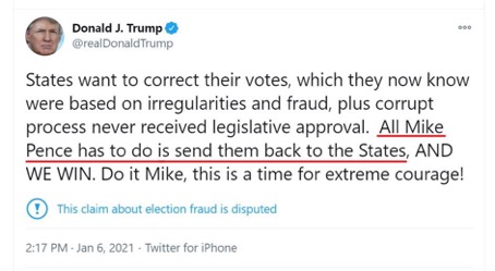 Następnie Trump domagał się od wiceprezydenta Pence’a, aby zablokował zatwierdzenie wyniku wyborów w Kongresie – ale Pence nie zgodził się na takie posunięcie. W ważnym wystąpieniu lider Partii Republikańskiej w Senacie Mitch McConnell stwierdził, że jeśli wynik wyborów zostałby obalony przez stronę, która przegrała, amerykańska demokracja wpadłaby w „spiralę śmierci”. Jak powiedział, „służę w Senacie od 36 lat. To będzie najważniejszy głos, jaki kiedykolwiek oddałem”.