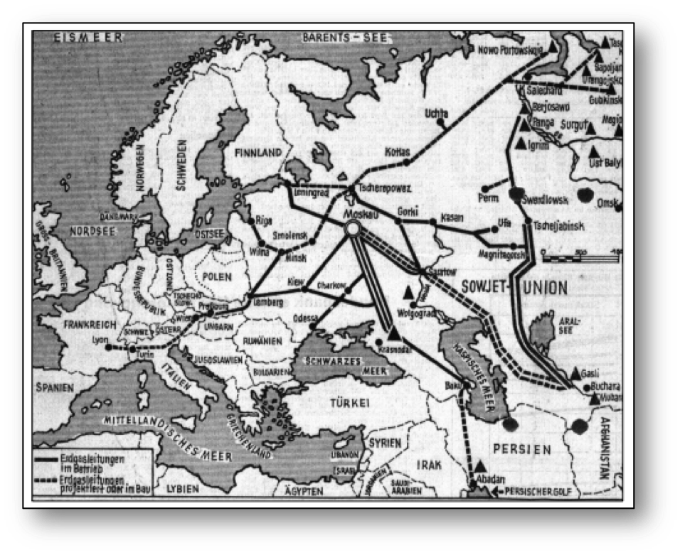 Ktoś może zapytać, co to ma wspólnego z energetyką? Wszystko. Zaraz po objęciu urzędu kanclerza, Brandt zaczął szukać platform do technicznej i gospodarczej współpracy z ZSRR, mających służyć budowaniu zaufania, niwelowaniu napięć – i obustronnym interesom. Idealnym narzędziem dla takiej współpracy okazał się pod koniec lat 60. gaz ziemny. W połowie tej dekady, kiedy technologicznie wykonalny i opłacalny okazał się przesył gazociągami na duże odległości, ZSRR utworzyło Ministerstwo Gazu – bezpośredniego protoplastę dzisiejszego Gazpromu. Rozpoczęto budowę gazociągu „Braterstwo”, który już w 1967 roku zaczął dostarczać gaz ziemny do Czechosłowacji, a niedługo potem do Austrii, skąd pompowano go dalej. Jak pokazuje mapka opublikowana w owym roku przez „Süddeutsche Zeitung”, RFN nie planowało z początku udziału w tym interesie, a austriacki hub obsługiwał dalsze państwa zachodnie – Włochy i Francję [1].