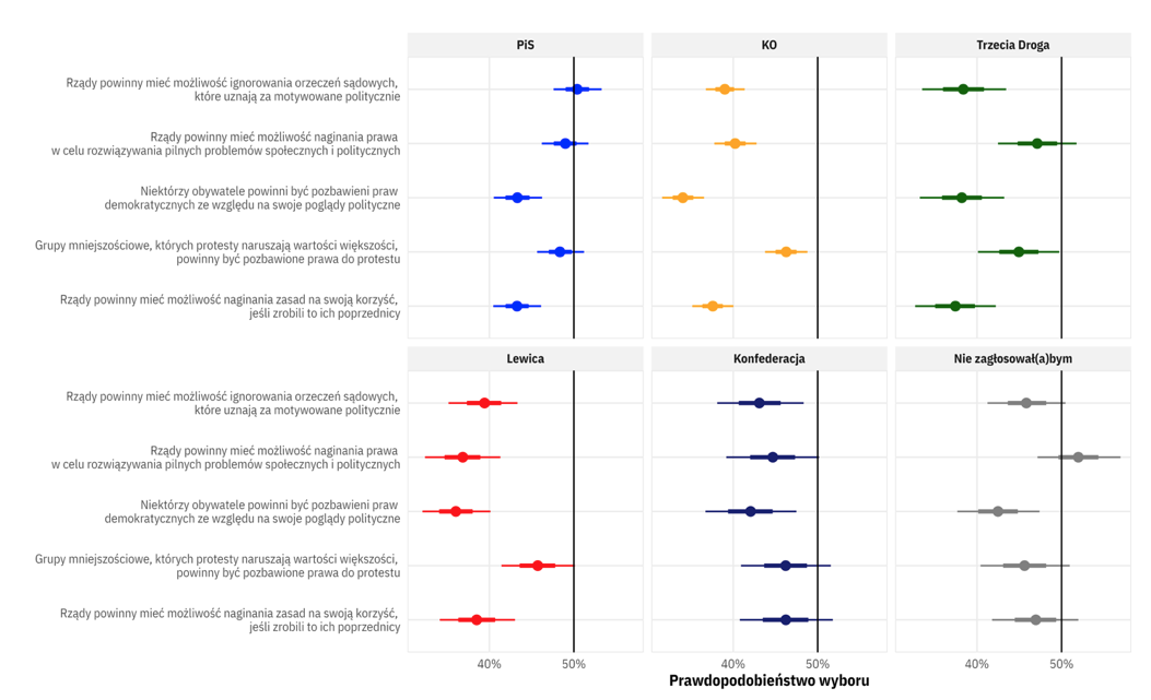 Z kolei wyborcy PiS-u średnio byli mniej skłonni tolerować kandydata, który uważa, że obywatele powinni zostać pozbawieni demokratycznych praw ze względu na swoje poglądy. Podobnie w sprawie poglądu, że rządy powinny być w stanie nagiąć zasady na swoją korzyść, jeśli poprzedni rząd to zrobił. Byli jednak równie skłonni głosować na kandydata, który popiera ignorowanie orzeczeń sądowych lub naginanie prawa w celu rozwiązania problemów, jak głosować przeciwko takiemu kandydatowi.
