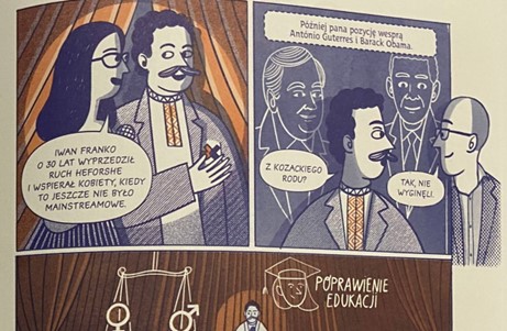 Oprócz tego, w komiksie autorzy dosyć często szukają męskiej aprobaty dla działań feministek. Nie brakuje przykładów, gdzie działalność kobiet jest doceniana głównie dlatego, że została pochwalona przez znanych mężczyzn. Jakby samo to, o co walczą kobiety, nie miało większego znaczenia, dopóki nie zostanie poparte męskim autorytetem. Stąd znajdziemy tu fragmenty o tym, jak Boris Hrinchenko opisywał działania Hanny Barwinok, jak Iwan Franko wspierał feminizm, a nawet o aprobacie Baracka Obamy czy António Guterresa. W efekcie feminizm nadal ukazywany jest przez męską perspektywę – kobiece słowa zyskują wagę, gdy otrzymają męskie poparcie.