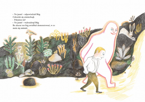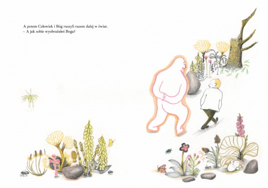 Integralną częścią książki Crowther są stworzone przez nią ilustracje. Oprócz wspomnianych już postaci głównych należy zwrócić szczególną uwagę na nieustannie towarzyszącą im przyrodę. Rośliny i pojawiające się w ich gąszczu zwierzęta są dynamiczne, dzikie, wręcz nieokiełznane – co w zestawieniu z raczej niespiesznym charakterem rozmów Małego Człowieka i boga otwiera drzwi do wielu interpretacji. Jedną z nich z pewnością może być starotestamentowa wizja raju z czającym się w jego gęstwinach złem. Należy jednak pamiętać, że mamy do czynienia z bogiem – nie „Bogiem” – zatem rośliny mogą mieć charakter bardziej uniwersalny – symbolizować wibrujące życie oraz naturę – bądź „Naturę” – zespoloną z bytowaniem człowieka. Nie ma natomiast wątpliwości, że każdy element znajdujący się na ilustracjach jest nieprzypadkowy, a jako ikonotekst opowieść Crowther formalnie jest absolutnie bez zarzutu.