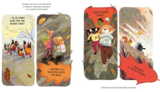 Tekstowi towarzyszą wspaniałe ilustracje, które zmieniają tonację kolorystyczną wraz ze zmianą, jaka zachodzi w Trollu: od szarości, czerni, brązów i zgniłej zieleni po pogodną soczystość wiosennego dnia.