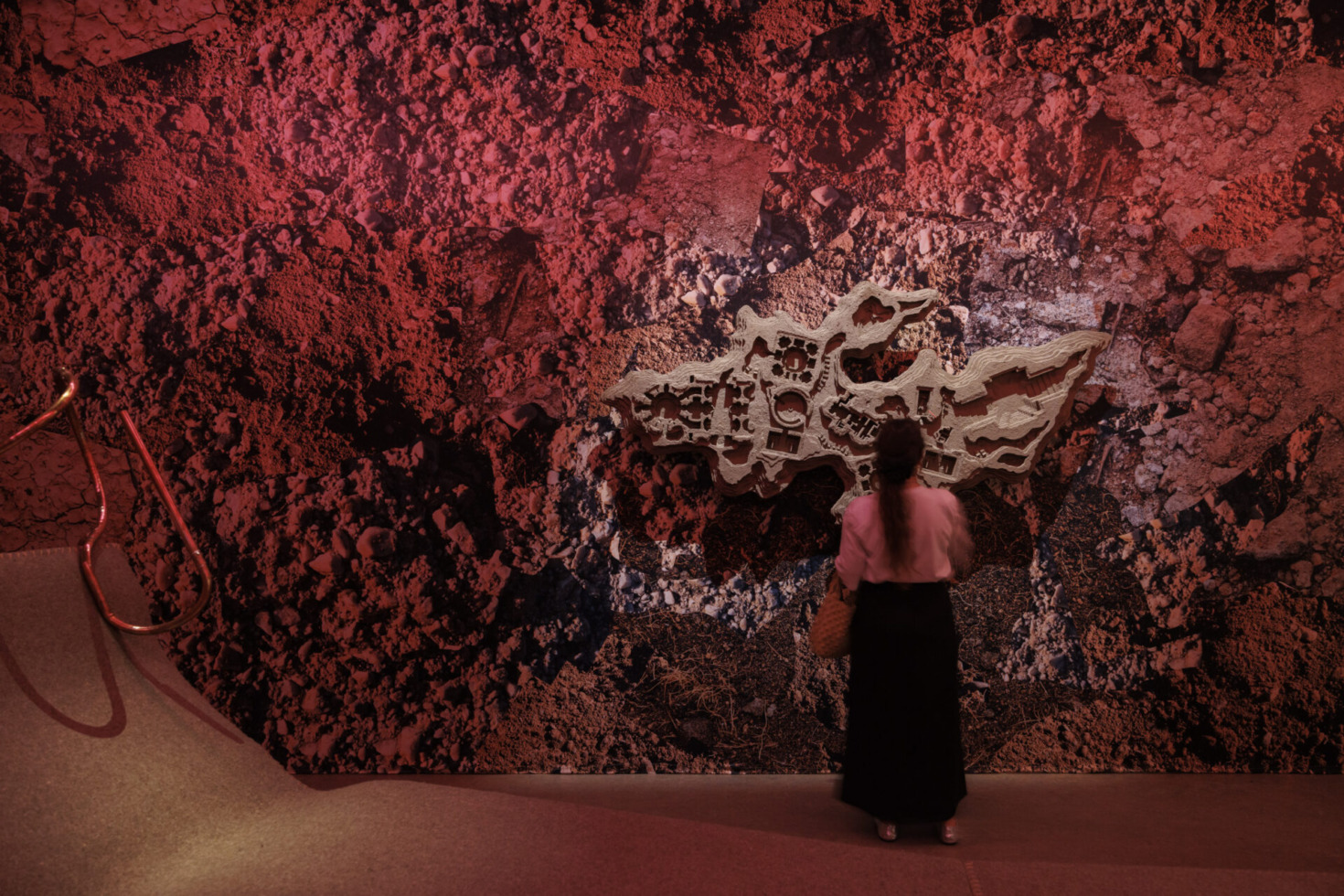 Zanim się jednak na nią weszło, trzeba było pokonać schody na pierwsze piętro, będące miejscem innej monumentalnej ekspozycji – czerwonych wstążek zwisających z sufitu. Ich długość – narastająca – odpowiada liczbie zgonów po każdej ze stron podczas wojny w Gazie. Pod każdą wstążką trwa codzienne odliczanie zgonów izraelskich i palestyńskich. Niewspółmierne i tragiczne konsekwencje ludobójstwa alarmują o sytuacji skrajnej nierówności. Nie tylko od 2023, ale i całe lata wcześniej podczas izraelskiej okupacji wiodącej – w optyce autorów instalacji – do działań Hamasu. Fakty ujęte są tu w poetycką formę. Bez obrazów przemocy, w symboliczny sposób prezentowane są tylko dane. Rosnący, czerwony pasek.
