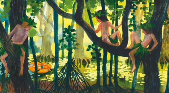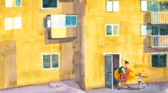 Przejście od kultury do natury wiąże się także ze zmianą komunikacji werbalnej na wizualną: w partiach ramowych wobec podróży pontonem słowa zapisane prostą czcionką na białym tle są tak skomponowane, że obraz zostaje pocięty na mniejsze kadry kojarzone z medium komiksu. Dopiero gdy bohater odpływa w głąb świata, pełnostronicowe ilustracje wkraczają na dobre i górę biorą barwne, dynamiczne, a nieraz przeładowane bogactwem elementów rozkładówki. Feeria postaci i przedmiotów ma jednak swoje znaczące intermedium: przypadkowe spotkanie z podobnie unoszącą się na pontonie długowłosą postacią również zostało oddane w podzielonej na mniejsze kadry sekwencji, która przypomina nie tyle rozmowę (zresztą bezsłowną), ile raczej taniec. To właśnie wpisana w obrazy melodyjność najbardziej zachwyca w książce obrazkowej Lundberg, a z pozbawionych warstwy tekstowej rozkładówek co rusz biją dźwięki: szum wody, warkot samochodów przejeżdżających przez miasto, codzienna krzątanina we wnętrzu jednego z domów czy muzyka akordeonu, na którym gra starszy mężczyzna. „Nikt, tylko ja” świetnie pokazuje, że angielskie określenie beztekstowych książek obrazkowych – nazywanych nieraz „silent books” [cichymi książkami] – jest wątpliwe, malarskie obrazy Lundberg nie tylko pokazują czy „mówią”, ale też sugestywnie „odtwarzają” melodie świata zwiedzanego przez głównego bohatera.