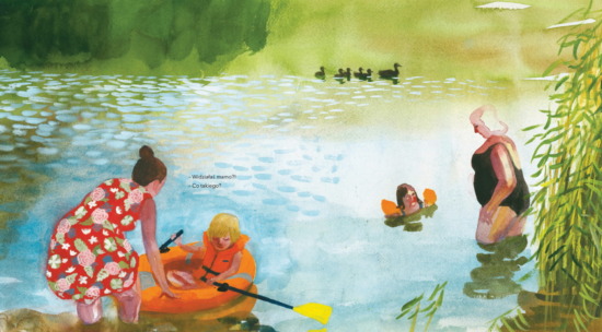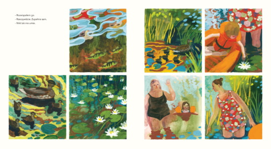 Szwedzka opowieść pełna wizualnych symboli w większości pozbawiona jest warstwy tekstowej, choć w początkowych i końcowych partiach pojawiają się krótkie dialogi między mamą i synem. Także w nich Lundberg udaje się w prosty, a jednocześnie otwarty na interpretacje sposób wyrazić narastające emocje chłopca i ekscytację płynącą z odkryć dokonanych w czasie podróży. Szwedzki tytuł „Ingen utom jag” musiał stanowić wyznawanie dla tłumaczki Anny Czernow, czego wyrazem jest zastosowany w polskim przekładzie przecinek, którego nagromadzenie w przypadku innej książki Lundberg – „Ten ptak, co mieszka we mnie, leci, dokąd chce” – wzbudziło moje zdziwienie [1]. Tym razem jednak przecinek ma moc, stawia bowiem w centrum właśnie postać chłopca, który odłącza się od mamy i wyrusza w pontonowy rejs, by odkryć świat dostępny poza zasięgiem matczynej uwagi. Zresztą jej postać nie daje mi spokoju: niby jest blisko syna, a jednocześnie wydaje się zdystansowana i niezaangażowana, zwłaszcza gdy chłopiec postanawia odpłynąć w dal. Kobieta zdaje się tego nawet nie zauważać, bo jest zaangażowana w rozmowę z inną postacią, która trwa aż do powrotu chłopca zwieńczonego krótką wymianą zdań: „– Co się stało? – Zniknęłaś! – Przecież jestem tu cały czas”. Chwilowa rozłąka nie oznacza więc rozstania na dobre, a jedynie zwrot ku samodzielności – wystarczy płynąć z prądem.