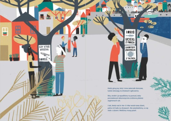 „Nadzieja”. To jedno z pierwszych słów, które widzi osoba sięgająca po wydaną przez Widnokrąg książkę obrazkową Marii João Freitas i Mariany Rio. Imię rybackiego kutra ukazanego na ilustracji okładkowej „O rybach, które zniknęły” każe wierzyć, że wszystko będzie dobrze, a dramatyczna informacja zawarta w tytule znajdzie pozytywne rozwiązanie. Jak jednak pokazuje lektura tej zaangażowanej ekologicznie książki, to w młodych osobach czytających autorki pokładają nadzieję na lepsze jutro – nie tylko ryb, które znikają z życia mieszkańców A-Ver-O-Mar, ale też całego wodnego ekosystemu. Na kilkudziesięciu stronach znaleźć można połączenie krótkiej historii i sporej dawki informacji na temat rybołówstwa, a taka hybrydyczna forma – nieobca współczesnej książce dziecięcej – robi zdecydowanie pozytywne wrażenie.