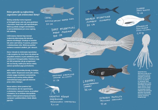 Aby jednak podtrzymać nadzieję na lepszą przyszłość, autorki kierują w drugiej części książki przekaz czysto informacyjny, objaśniając, czym jest ekosystem, przełowienie ryb czy bioróżnorodność. To świetne uzupełnienie części narracyjnej, która niewątpliwie może sprowokować pytania młodszych i starszych osób czytających, a odpowiedzi na przynajmniej część z nich znaleźć można w drugiej części publikacji. Co zaskakuje, obok zrównoważonego pozyskiwania przez ludzi ryb nie ma jednak mowy o dobrostanie żyjących w morzu zwierząt, a mięsna dieta Tomása, który „bardzo lubi dania z ryb i owoców morza”, zdaje się legitymizować przemilczenie w książce takich kwestii, jak całkowita rezygnacja z diety mięsnej i idące za tym wstrzymanie połowów. „O rybach, które zniknęły” może nie trafić na podatne pole w wegetariańskich i wegańskich domach, choć pod względem czysto formalnym książka Freitas i Rio jest naprawdę atrakcyjna.