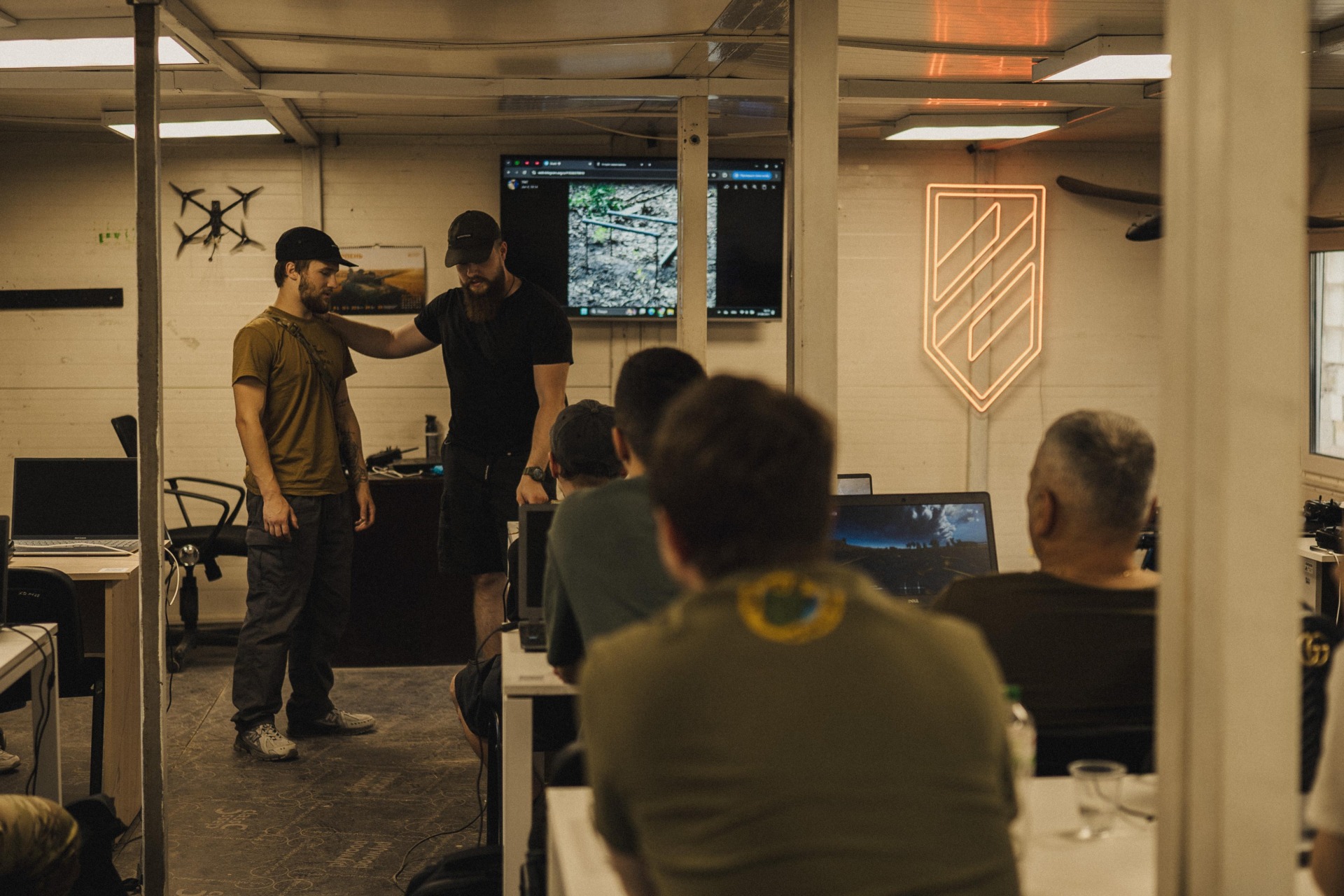 W hali powietrze przecinają drony z wysokim, nieprzyjemnym świstem. Na piętrach — teoria, wykłady w salach z łuszczącą się farbą i biurkami zbitymi z resztek sklejki. Ludzie, którzy tu siedzą, za tydzień mogą pracować cztery kilometry od rosyjskich pozycji.