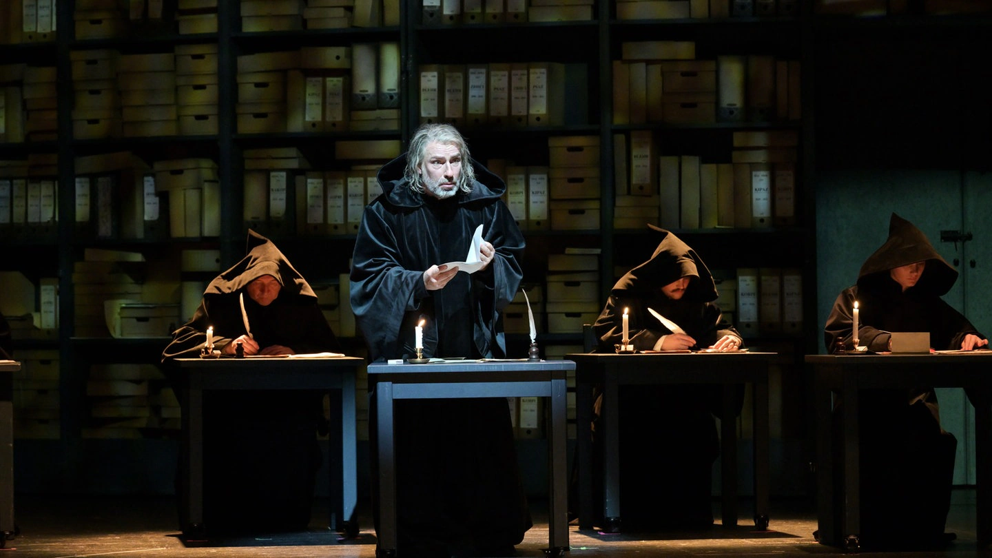 Wyjątkowa rzecz dzieje się już na początku spektaklu – narracja mnicha Pimena. Posępna, a zarazem dostojna, niemal sakralna, określa wyraźnie temperaturę emocjonalną tego spektaklu. Partię wykonał Andreas Bauer Kanabas i jednym słowem można określić jego kreację jako hipnotyzującą.
