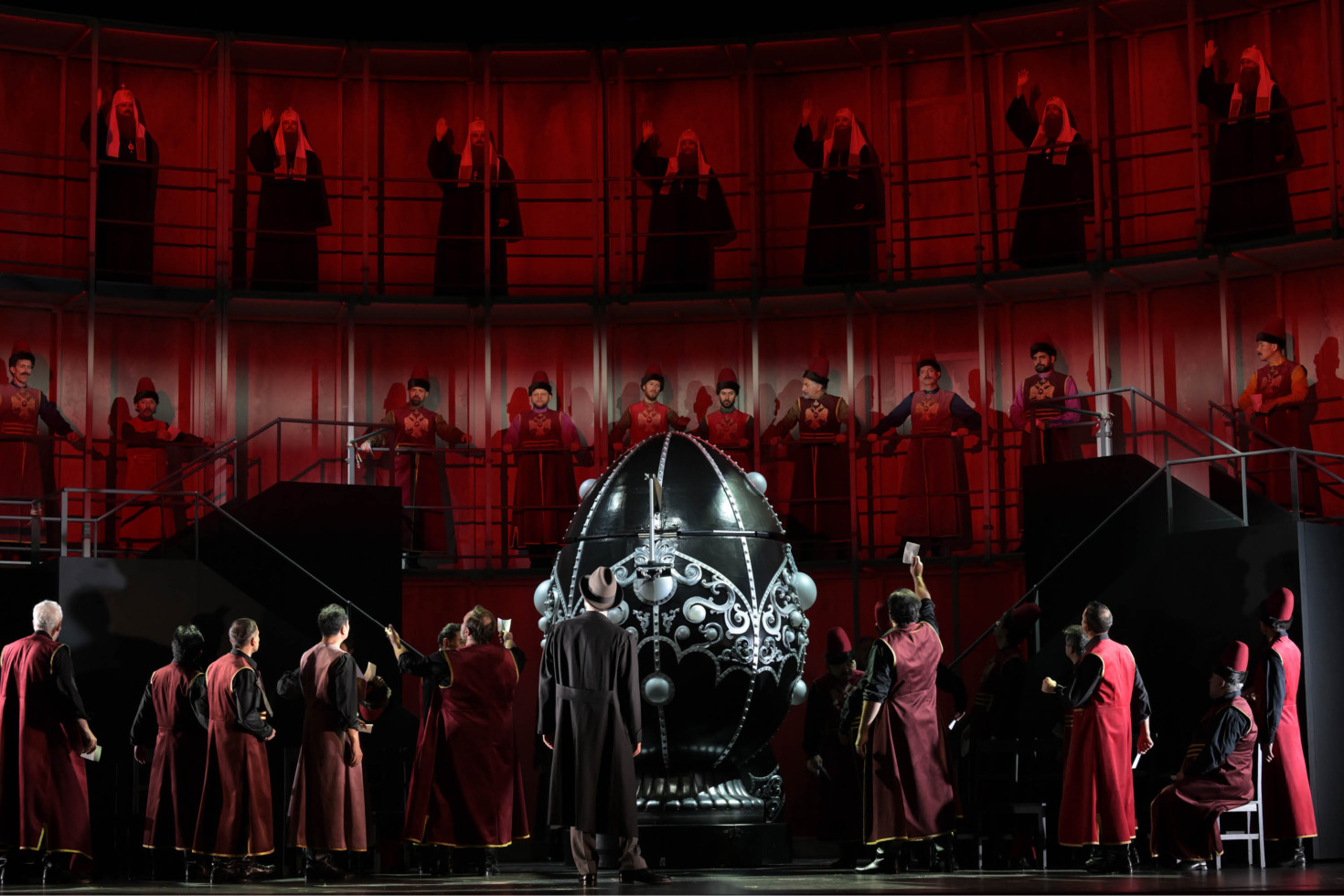 Nad całością czuwa muza absurdu i groteski. Oto car siedzi w monstrualnym jaju od Faberża, no bo jakim innym? Z drogocennym jajem wszyscy się cackają, a w środku kluje się szaleństwo rosyjskiej władzy. Tak wtedy, jak i dziś.