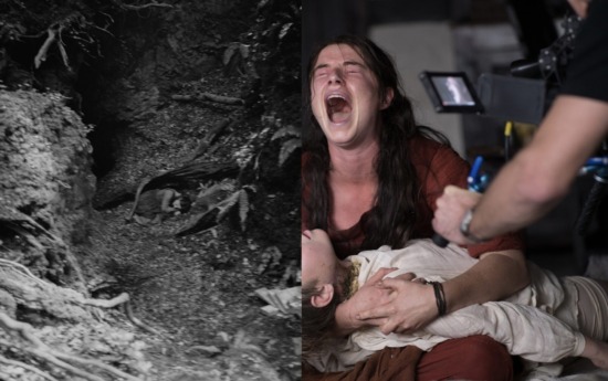 Fundamentalne wybory dotyczyły drzewa – kluczowego miejsca akcji, poszukiwanego w lasach Lidney Park na dokumentacji wiosną – choć latem miało ono wyglądać już zupełnie inaczej w związku z bujną roślinnością. Operator i reżyserka pozostawili więc całą ekipę i poszli na spacer po lesie, gdzie po pół godzinie znaleźli to właśnie, jedyne, wyjątkowe. Żal relacjonuje: „Chloe chciała, żeby pień miał w korzeniach mroczną jamę – niczym waginę, wspólny pień, z którego wyrastają dwa drzewa. Z tego powodu odrzuciła też potem przestrzeń prawdziwego teatru The Globe, gdzie miały powstać zdjęcia; powiedziała wtedy: „Słuchajcie, nie możemy tego tutaj kręcić, bo ta przestrzeń zupełnie nie przypomina wnętrza martwego drzewa”. Na to Fiona Crombie, scenografka: „Dobrze, Chloe, zbuduję ci taki teatr, bo miejsce musi być wiarygodne”.