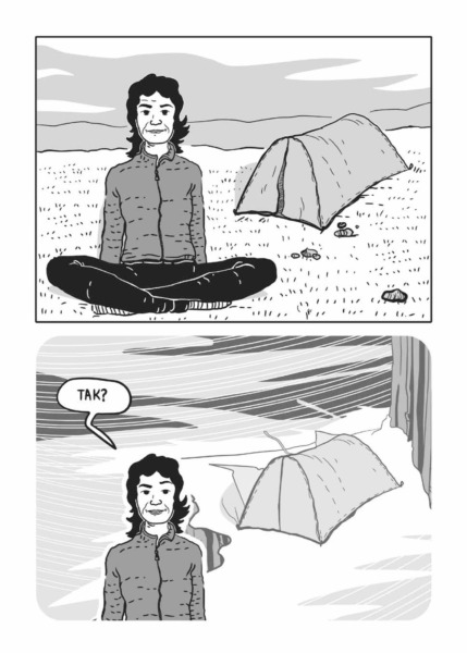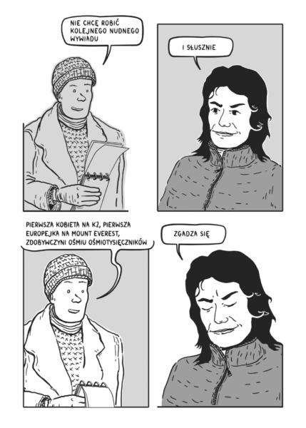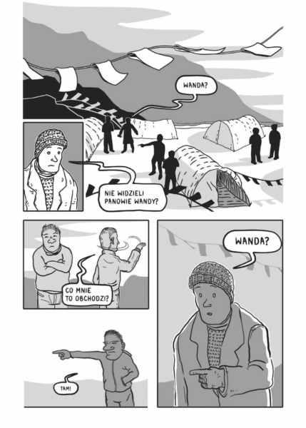W pracach Zvyrke jest zdecydowanie więcej oddechu i przestrzeni, a artystka śmielej i w ciekawszy sposób wykorzystuje zimowy krajobraz, czego najlepszym przykładem – najbardziej emblematycznym, ale i najbardziej kreatywnym – jest rozkładówka, na której kroczącą figurę Wandy „pożera” śnieg. Himalaistka idzie przed siebie ze spuszczoną głową, a jej postać zanika częściowo przykryta bielą, która dominuje na tych stronach. Jednocześnie Zvyrke bawi się odległością, stwarzając iluzję, jakby obraz z prawej strony został w całości zasłonięty przez sypiący tuż przed naszymi oczyma śnieg. Wanda znika więc w zamieci, pochłonięta przez góry. Takich mniej oczywistych zabiegów jest zresztą więcej, jak wtedy, gdy Wanda ostatecznie oddala się od towarzyszącego jej mężczyzny, a jej znikającą w oddali sylwetkę obserwujemy w formie odbicia w jego goglach.