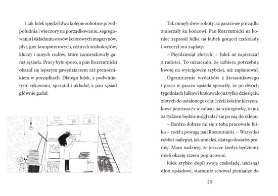 Wybór trzeciej książki w tym zestawieniu może nieco dziwić – ze względu na utylitarny, nieliteracki charakter tej opowieści. Bo też i nie jestem entuzjastką książek samopomocowych, które służą tylko do przepracowania z dzieckiem jakiegoś zagadnienia i są swoistą „instrukcją obsługi”. Jednak książka Sylwii Bekier-Wojciechowskiej jest w tym segmencie wzorem dobrej praktyki. Po pierwsze tworzy ciekawy portret rodziny: tytułowego Julka, jego młodszej siostry Milusi, szczurka Ratki, rodziców i dziadka Stefana. Nie pomija też relacji rówieśniczych, koleżeńskich i przyjacielskich. Po drugie, ma ciekawą fabułę, wartką akcję i jest dobrze napisana. A po trzecie jest interesująca ilustracyjnie i edytorsko, a to nieoczywiste w takich publikacjach. Czarno-białe rysunki Agnieszki Pradelok są zabawne i przyjemne w odbiorze, czasem pełnią też funkcję dodatkową, kiedy stają się wyszukiwanką (gdzie jest Ratka?) albo swoistą infografiką (czym jest popyt, a czym podaż?).