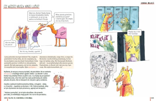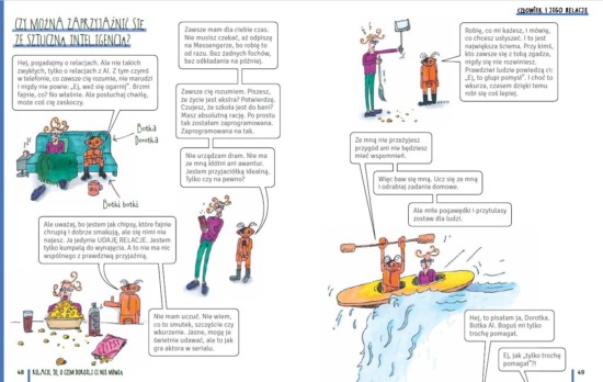 Seria od początku wyróżniała się ambicją podejmowania tematów z pogranicza natury, kultury i życia społecznego – od emocji, przez seksualność, po zagadnienia ekonomiczne i środowiskowe. Dotychczasowa recepcja serii pokazuje, że jest ona jedną z najciekawszych propozycji popularyzatorskich na polskim rynku książki dziecięcej – cenioną za klarowność wywodu, poczucie humoru i odwagę podejmowania tematów trudnych, choć niekiedy budzącą drobne kontrowersje związane z ironicznym tonem narracji czy obecnością subtelnych odniesień światopoglądowych (z czym ja akurat nie miałam najmniejszego problemu). Janiszewski i Skorwider pozostają wierni swojej formule również w tym tomie. W „Relacjach” koncentrują się na jednym z najbardziej fundamentalnych aspektów ludzkiego (i nieludzkiego) doświadczenia. Istotne jest przy tym szerokie ujęcie tematu: relacje rozpatrywane są nie tylko w kontekście międzyludzkim, lecz także międzygatunkowym oraz – co szczególnie warte podkreślenia – jako relacja jednostki z samą sobą.