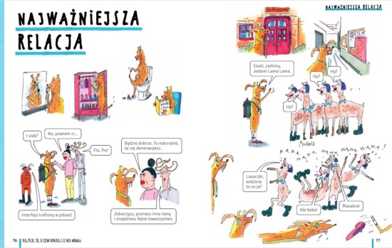 Konstrukcja narracyjna książki również pozostaje spójna z wcześniejszymi tomami. Przewodniczką po tomie jest charakterystyczna sepleniąca lama Lama, wobec której autorzy – obecni w książce jako postacie – przyjmują rolę przewodników po świecie ludzkich dorosłych. Ten zabieg nie tylko porządkuje przekaz, lecz także wprowadza element autoironii i dystansu, tak istotny w komunikacji z młodym odbiorcą. Dodatkowo publikacja silnie osadzona jest w uniwersum serii: pojawiają się liczne odniesienia do wcześniejszych części, takich jak „Ekonomia” czy „Dojrzewanie” (autorzy odsyłają do znajdujących się w nich definicji), a także powracający bohaterowie (między innymi Harry, Bert i Marta, czyli pierwsi ludzie). Tego rodzaju intertekstualność buduje ciągłość i zachęca do lektury kolejnych tomów, a także pokazuje spójność twórczego i merytorycznego zamysłu autorów. Dekodowanie tego uniwersum staje się rozrywką tylko dla wiernych fanów – i słusznie. Nikt nie obiecywał, że uczenie się świata będzie łatwym zadaniem.